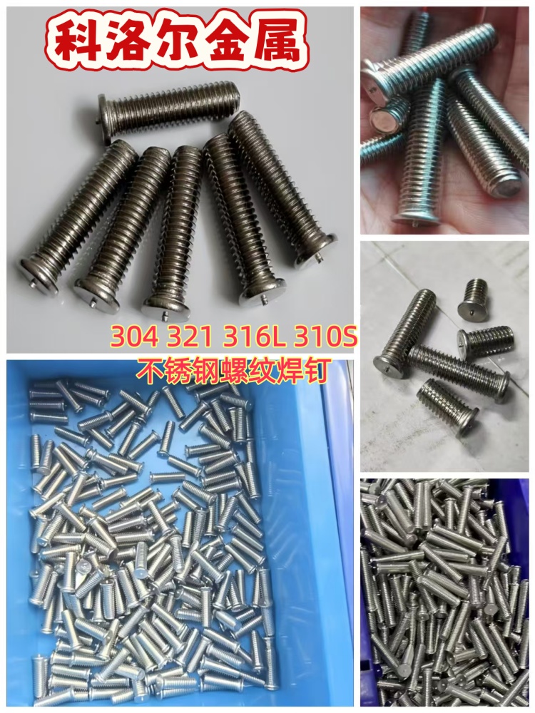 不锈钢螺纹焊钉(又称不锈钢点焊钉)主要用于焊接工艺中,通过储能焊接或拉弧焊接将螺钉固定在金属表面,适用于各种锅炉、钢结构建筑等领域。 常见规格 主要规格包括M3、M4、M5、M6、M8、M10-M28等型号,长度根据需求可定。GB902.3、GB902.4等国家标准规格。 材质选择 常用材质为304不锈钢(耐腐蚀性强)和316L不锈钢(耐腐蚀性更高),适用于户外或潮湿环境, 310s耐热钢用途高温窑炉。 应用场景 汽车保险杠、车身装饰板固定 机械设备紧固件 储能焊接工艺(如拉弧焊、碰焊)